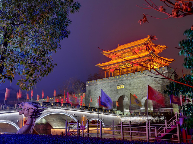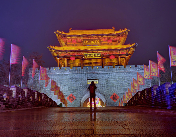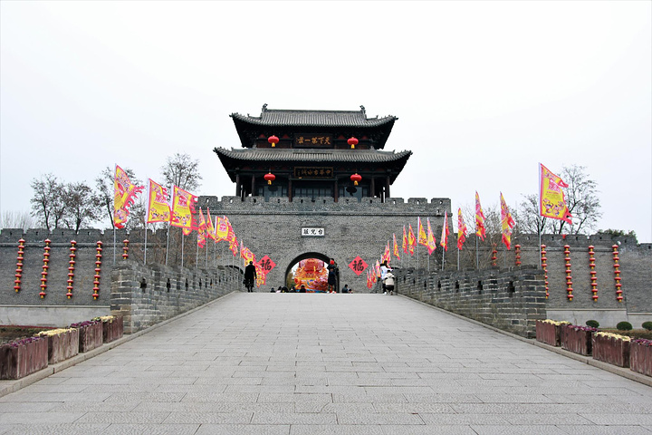 下了游船向城门方向走去,横跨在古运河之上的一座石桥将庄内庄外相连,桥的两侧插满了随风舞动的旗帜,远处的城墙上挂着一串串红灯笼,城楼上“天下第一庄”五个金色大字颇有气势。早在明清两朝,当时的君王每次巡视京杭大运河都会在台儿庄登岸巡游,乾隆皇帝在一次巡游中看到台儿庄南北贸易往来,一片繁荣景象,便赐台儿庄为“天下第一庄”。