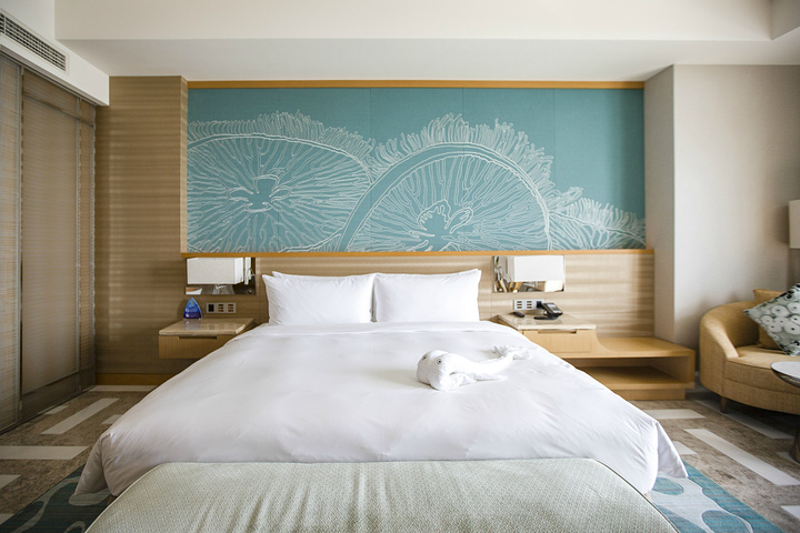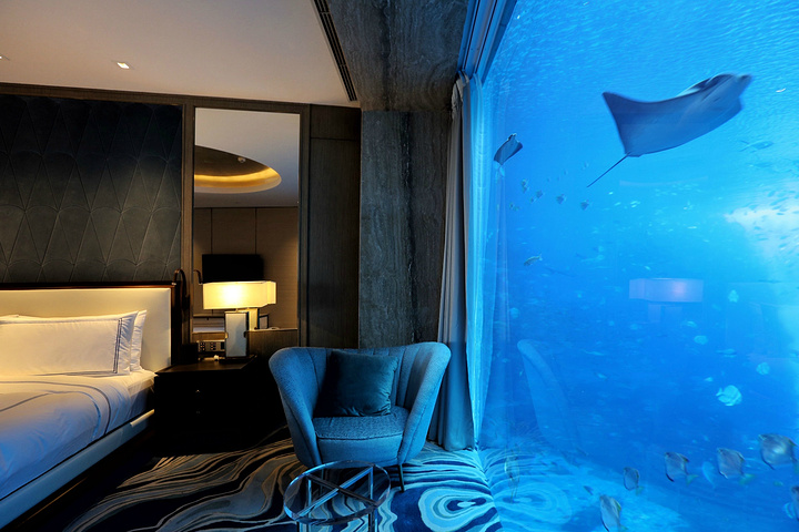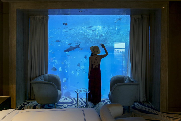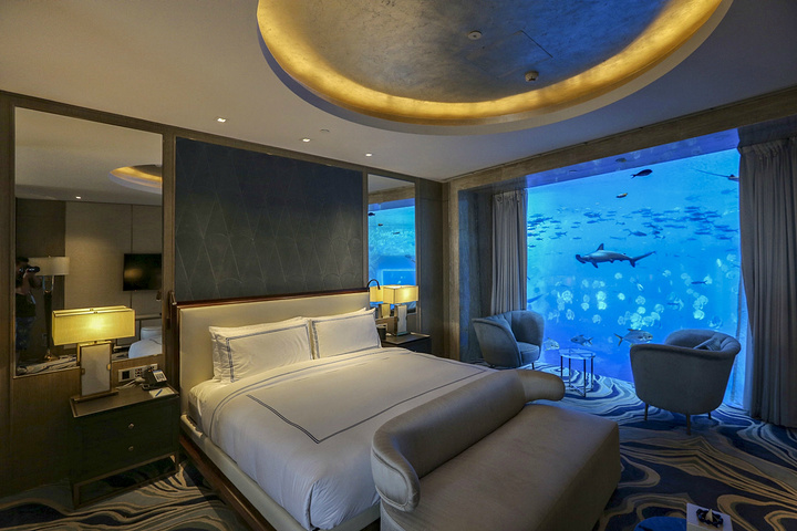 或者悠闲地躺在床上,通过卧室的巨大亚克力立面欣赏大使环礁湖景色,仿佛置身海底,与数不清的海洋精灵共同起居。