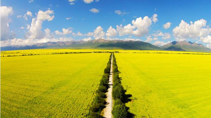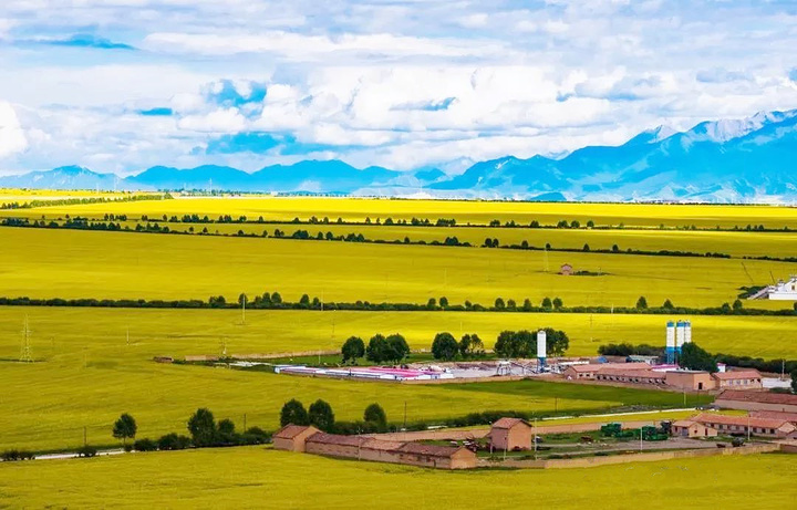 油菜花并不稀奇,哪里都有,但门源的油菜花气势壮观,北依祁连山,西起永安城,东到玉隆滩,南邻大坂山,绵延上百公里,宛如金黄的大海。浓艳的黄花,紧沿着浩门河畔,七月中旬,门源的油菜花竞相怒放,花景与当地的蓝天白云、高山流水、林海草原和独有的民居、蜂农等交相辉映,变幻出一道道独具特色的迷人风光,令无数游客迷醉其间。