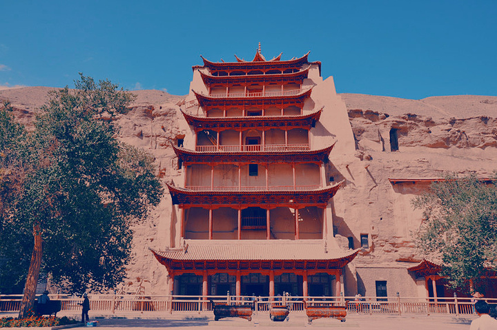 莫高窟,俗称千佛洞,坐落在河西走廊西端的敦煌 ,它始建于十六国的前秦时期,历经十六国、北朝、隋、唐、五代、西夏、元等历代的兴建,形成巨大的规模,有洞窟735个,壁画4.5万平方米、泥质彩塑2415尊,是世界上现存规模最大、内容最丰富的佛教艺术地,是一座伟大的艺术宫殿,是一部形象的百科全书,被列为“世界文化遗产”。