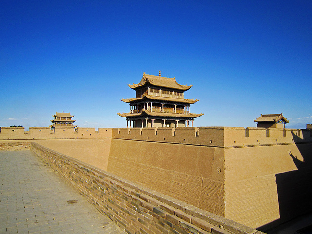 嘉峪关 ,号称“天下第一雄关”,城关两侧的城墙横穿沙漠戈壁,北连黑山悬壁长城,南接天下第一墩,是明长城最西端的关口, 嘉峪关是古代“ 丝绸之路 ”的交通要塞, 中国长城三大奇观之一。 嘉峪关是世界文化遗产,国家AAAAA级旅游景区,全国重点文物保护单位,全国爱国主义教育示范基地。主要景点有 嘉峪关 关城、悬壁长城、长城第一墩、魏晋墓群、 黑山 石刻、 木兰城、滑翔基地等。