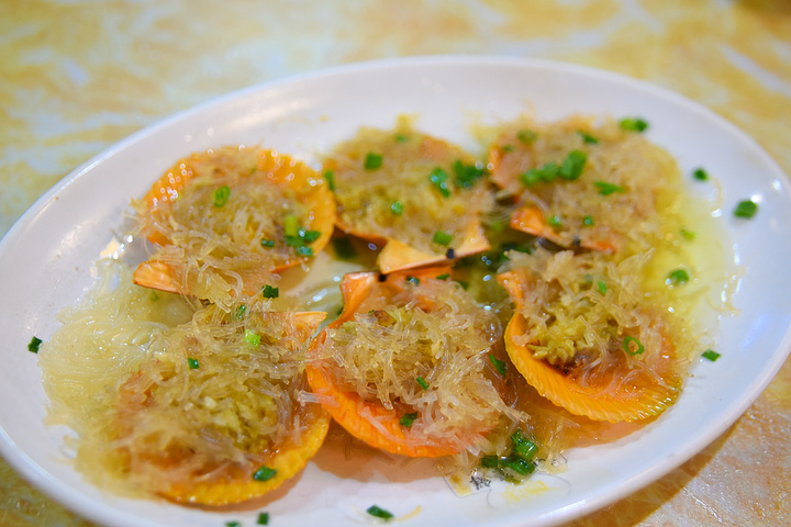 蒜蓉粉丝蒸扇贝,肉很有嚼劲,蒜蓉覆在粉丝上,粉丝又把扇贝肉包裹起来,微生的蒜蓉特有的香气完全融入粉丝中,而粉丝较弹软的口感跟扇贝肉劲道肉质及鲜甜味形成丰富得味觉层次,一口下去,满嘴都是香味;再加上摆盘撒上点缀的葱花,跟微红的扇贝壳、白嫩的粉丝形成视觉上的冲击,一看就很有食欲。