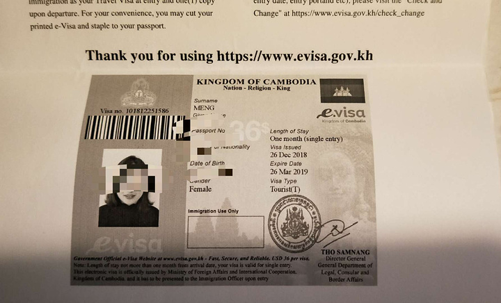 柬埔寨对中国是落地 (visa on arrival) 和电子签(e-visa)两种。但是一般便宜的航班都在晚上,落了地去排队办签证真的很累,所以建议出发前提前在柬埔寨移民局官网,自行申请,发送到个人邮箱,打印就可以了,24小时出签,费用是37美金/人,网址:http://www.evisa.gov.kh。这样下了飞机就可以快速过关享受28°的愉悦夜晚了!电子签如图: