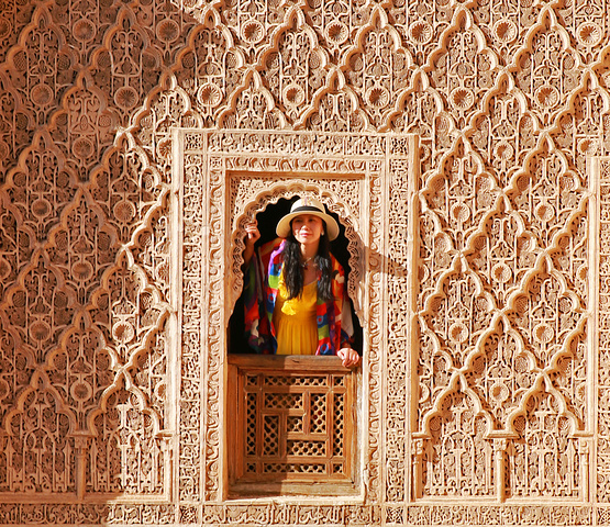 拾步走上二楼,欣赏着走廊边上的有着漂亮雕花的廊柱,迈步走入学生们的小房间,透过精美窗格向下望一望开阔的学院前庭,然后抬头平平地细细注视一下对面窗棂的宁静之美,想象着几百年前的学子们在此房间里孜孜不倦,求知若渴地诵读着古兰经的情景……而不时在对面窗棂显现的游客留影将你拉回到现实,发现这绝好的照相取景地之后,我也乐呵呵地不能免俗地摆拍了几张。