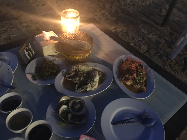 夜幕降临,点的海鲜也上桌了。一斤大明虾、一条石斑鱼、几个🐚。沙滩上有乐队点唱活动,远处看到了久违的烟花,抬头是满天繁星,迎面是🌊拍打的声音。够有情调吧!