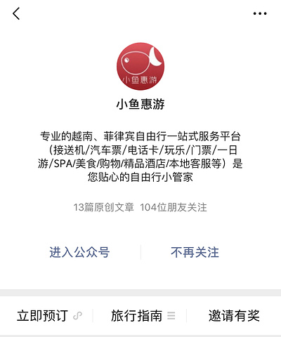 而如果你在宿务或者 薄荷岛 ,就推荐「小鱼惠游」,它家是公众号和小程序,因为专注 越南 和 菲律宾 所以相对服务专一。之前因为一直舍不得取舍 薄荷岛 ,于是做攻略对比了其他家,他家价格是比较合适的,并且是 菲律宾 本地团队,还有自己的 菲律宾 旅游群,可以许多信息共享,约伴出行。