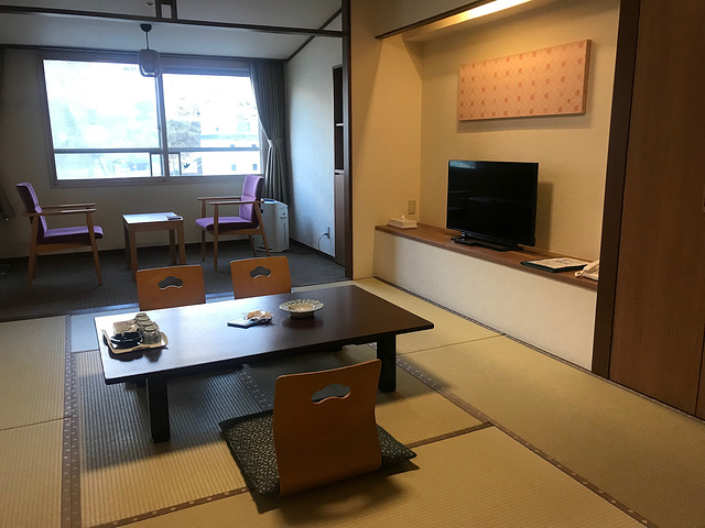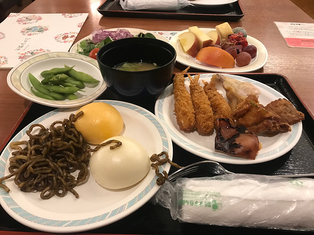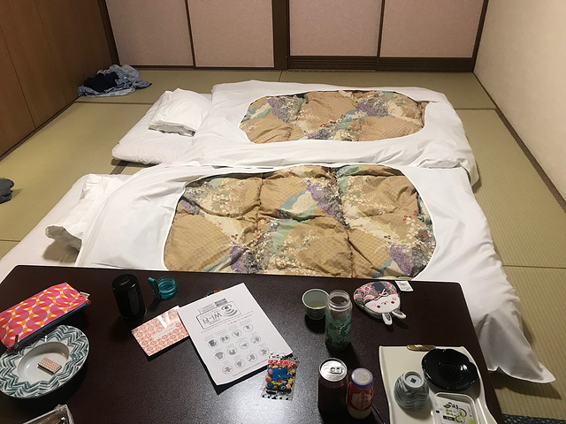 回到房间稍事休息,去吃晚餐。餐厅在二楼,门口排队等服务生领到餐桌旁,告知餐桌号码,吃完翻牌。餐厅很大,我们各选所爱,牛排,天妇罗,长腿蟹,沙拉~~吃饭中间观察一下,食客中有一半是中国人,其余应该是日本、韩国还有一些印度人,很少有可能是亚洲人更喜欢泡温泉。吃饱喝足回房间,推开房门,发现榻榻米没变化,有点小小的失落,泡上酒店的粟米茶,玩会手机休息时两个四十岁左右的大妈敲门问好而入,笑眯眯移茶几椅子,动作熟练,几分钟铺好,鞠躬退出。我们也换上浴袍下去泡温泉,和国内温泉不同,日本的温泉男女分开,女士温泉在负二楼,按攻略我们只拿了一个小毛巾进入,先冲洗一下,盘起头发,头顶毛巾跳进温泉池,泉水温度不低,泡起来十分舒服。四周环顾,雾气缭绕,有大概二十多人分布在房间近十个池水中,十分安静。仙境酒店是拥有全日本温泉池最多的日式酒店,4种温泉泉质(硫磺泉、食盐泉、单纯硫磺泉、酸性铁泉)。我们泡了几个决定去外面泡露天风吕,毕竟是十二月,冲出去是需要一点勇气的,好在池子就在门口十几米远的地方,跑进去立刻就温暖了。室外汤池记忆中应该有五个,两大三小,夜雾中灯光摇曳,池对面的山坡上疏影横斜,十分惬意。