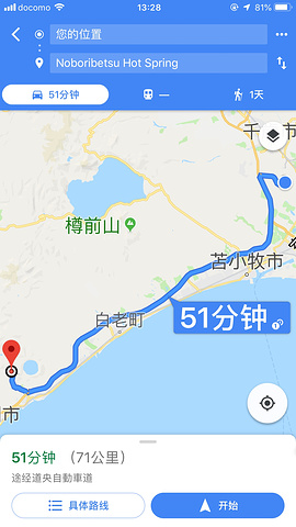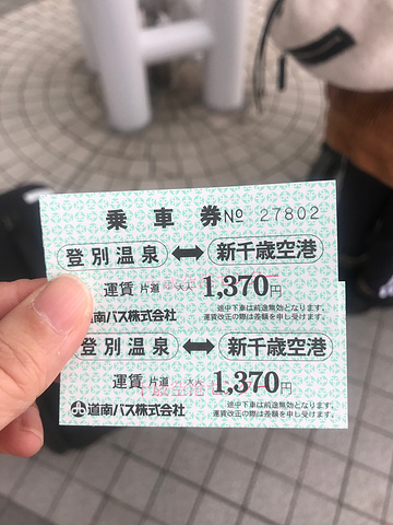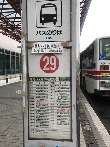新千岁机场提了行李,按照攻略的指示找到了发往登别的29号站台,站牌上贴着一张中文告示:请到23号附近买票再乘车。买票地点有点远,两个人不敢分开,拖着箱子折回23号找到了买票的柜台,两张到登别温泉中街的巴士票,售票员是两位四十岁左右的女士,票交给女儿后用英语告诉我们:巴士先从66号站台发车,29号站台不一定有座位,赶不上的话要等下一趟,或者我们可以去66号坐车,走过去大概要20分钟。然后仔仔细细的将线路画给我们,这就是我喜欢的日本特色,服务人员尽心尽力。因为距发车时间还有半小时,我们选择在29号等。排队的人里面,中国人占大多数。我们运气还好,有座位。