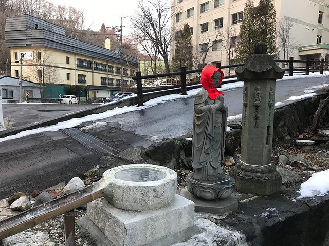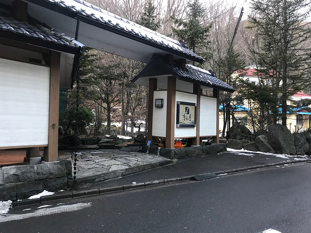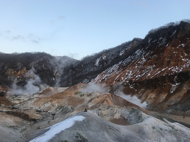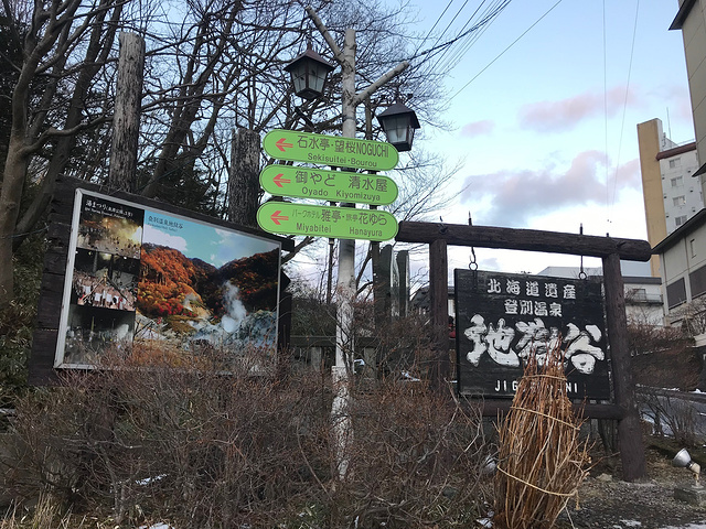 因为酒店订的晚了,没有无烟房了,实在喜欢这个酒店的温泉,烟味也就忍了,上了六楼,房间还是让人眼前一亮,日式房,透过窗户可以看到熊牧场的缆车,两人休息了一会,鉴于昨天下午四点多天就黑了,我们赶着去地狱谷一探究竟。可能前不久下过雪·,沿着街边人行道一路走去,有些地段并不好走·,按照导航我们先去大汤沼,却发现路被封了,无奈改道去地狱谷展望台,几分钟的路程就到了。
