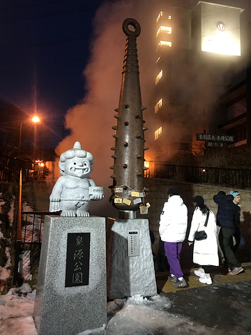 踏上回酒店的路程,前方不远处传来类似于蒸汽机般的轰鸣声,循着声音望去,雾气腾腾的不知何物。好奇心驱使我们一探究竟,响声来自主街一侧,源泉公园,第一泷本馆酒店楼下,非常迷你,标志是下沉广场最深处的泉眼以及公园广场中的9根颜色不一样的狼牙棒。公园的得名,是守护登别温泉的“汤鬼神”与其9个泉种。公园的亮点是最深处的“间歇泉”,也是整个登别温泉的泉源处,因为存在一定程度的安全隐患,泉眼外是被栅栏围住的,在白天视线好的情况下,隐约还是能看到泉眼一直在沸腾翻滚的动态的。赶得巧,被我们不经意间路过了~~