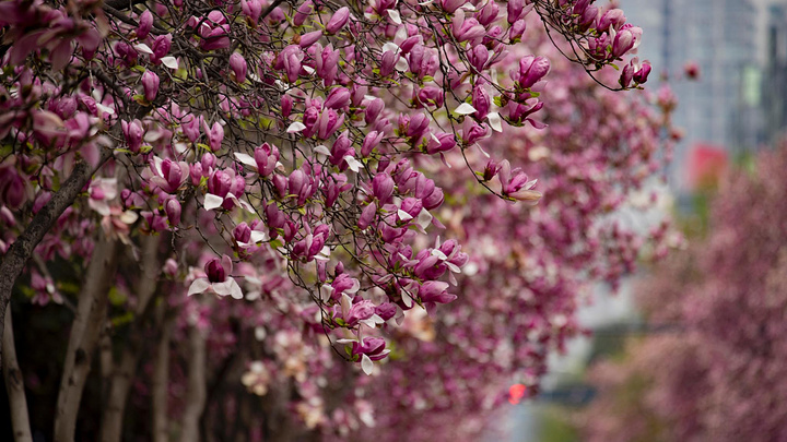 西安高新一路,路两边几百株紫玉兰盛开,吸引了不少路人和摄影爱好者拍摄。