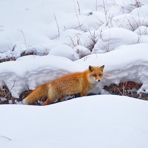 正当我们深一脚浅一脚地在积雪的栈道上艰难行走时,不知道是谁发出了一声惊喜的呼唤:“快看,是狐狸呀!”,我们三人顿时腰也不酸了脚也不滑了,三步并作两步在雪地上奔跑了起来,可谓是健步如飞,总算是眼疾手快地和狐狸打了个照面,拍下了珍贵的影像记录。想必遇见狐狸,一定是一件无比幸运的事情,给我们的旅行开了个好头!↓