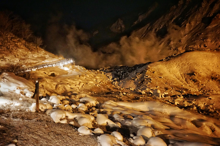 用完晚餐后,我们决定去地狱谷走一遭“鬼火之路”。天色已晚,我们三人磕磕绊绊往地狱谷方向走去,一路上能看到冒着滚烫蒸汽的间歇泉眼,喷涌的声音好像一辆老旧的火车正从地心深处驶来,却永远不曾到站。地狱谷的栈道两侧设有小灯,弯弯绕绕,灯光忽隐忽现,远远望去仿若幽冥鬼火,寒气沁人心骨。↓