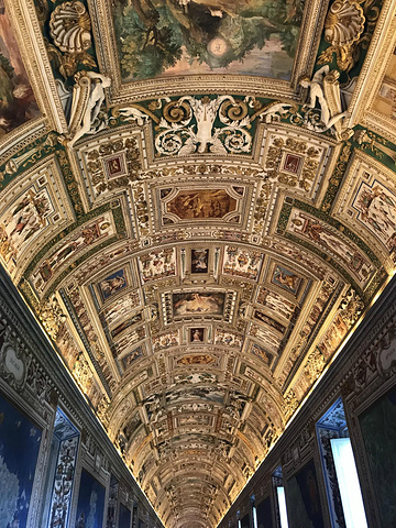 米开朗基罗在西斯廷礼拜堂的巨作《创世纪》和《最后的审判》,一走进西斯廷教堂,立马被满天满地的壁画震撼到了,天呀,这怎么画上去的,而且还画得那么逼真,人物栩栩如生,充满了立体感。这里面是不允许拍照的,出门的时候偷偷扭头拍了一张。教堂顶部是《创世纪》,据说这幅大型壁画耗费了4年多才完成。