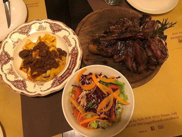 如何选择餐厅,我们一般就在住的酒店附近搜猫途鹰,看上面的点评和推荐菜,很方便的,而且推荐餐厅的味道都很不错。这家佛罗伦萨餐厅,我们在猫途鹰上选的,环境非常好,T骨牛排非常不错,很实惠,这里的牛排一份都是1公斤,够我们三个人吃了。红酒也不错,1杯酒5欧,一瓶酒15欧。