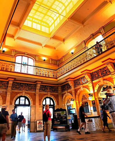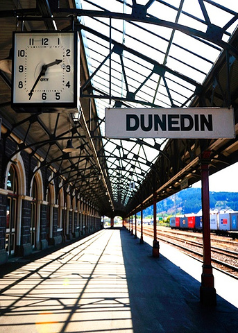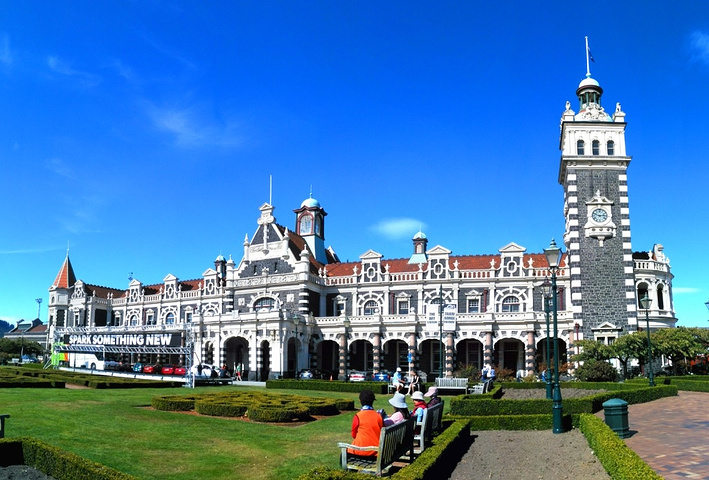 从第一教堂出来,我们来到达尼丁火车站。车站启用于1906年,是一座法兰德斯文艺复兴风格的建筑,半圆拱顶、对称的门窗、半圆形窗都是其特征。外观采用了两种奥塔哥特有的石材:一种是黑色的火山石;另一种是白色的石灰岩。这两种石材的交互运用,形成了和谐的节奏感。达尼丁火车站以其庞大的规模、宏伟的风格和丰富的装饰为世人所称颂。这里有世界上排名前十的观光火车游览项目。