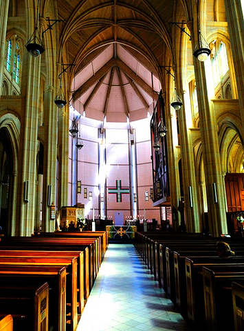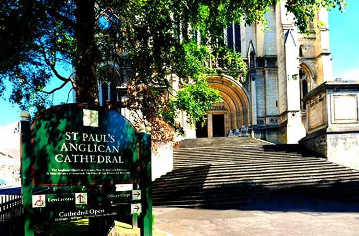 市政厅的旁边就是圣保罗大教堂。这是一座建于19世纪的欧洲古堡式建筑,在新西兰非常罕见。高达40米的石柱承载着新西兰唯一的石造圆拱形屋顶。教堂采用奥马鲁所产的石灰岩砌成,外墙镶着华丽的彩绘玻璃。