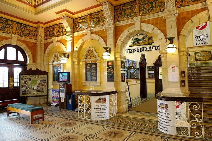 车站内部采用温暖的鹅黄色为主调,当阳光从正中央的圆拱顶上洒下来,正好照在了地面精细马赛克镶嵌图案上。地坪正中央是新西兰铁路的标志。这个火车站的主站台长达1公里,是新西兰国内最长的站台。所有这些,使得达尼丁火车站与圣多米尼克小修道院、奥塔哥大学钟塔、第一教堂等蕴含着苏格兰气质的建筑,成为文艺复兴时代最杰出的代表性建筑。