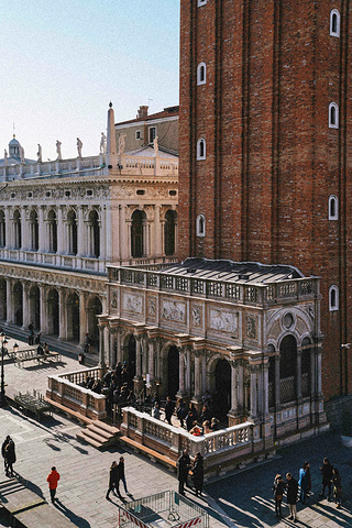 圣马可钟楼自十五世纪末就以矗立在圣马可广场上,它既是威尼斯城市的纵坐标,也是广场建筑群空间构图的重心。风光宜人的威尼斯城、波光粼粼的潟湖、绵延的阿尔卑斯山在这里一览无余。
