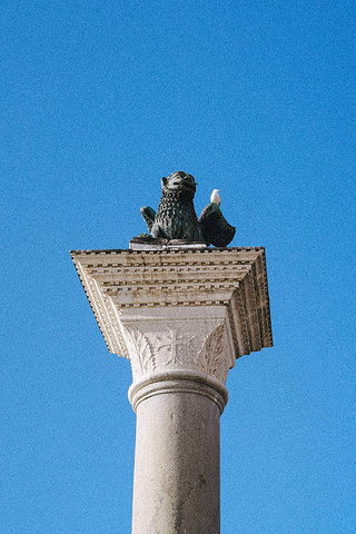 威尼斯到处都能看到有关狮子的标志,无论是在圣马可广场的入口处,还是在那两根高大的圆柱,都挺立着一只展翅欲飞的青铜狮,这仿佛是威尼斯人对自己的信仰者的象征。飞狮左前爪扶着一本圣书,上面用拉丁文写着天主教的圣谕:“我的使者马可,你在那里安息吧!”