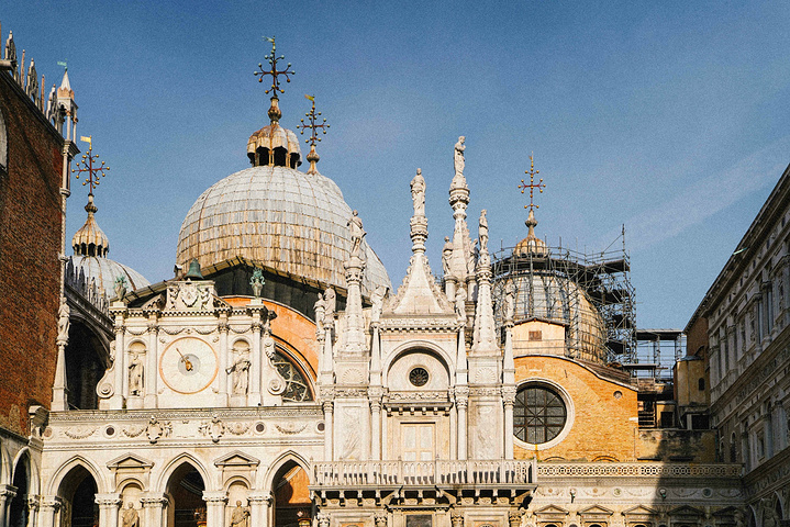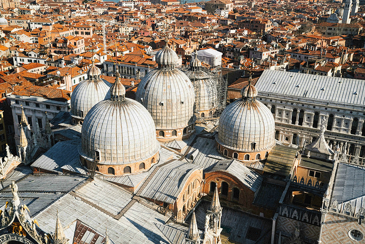 圣马可钟楼的下面有五个隆起的穹顶,就是人们常说的圣马可教堂的圆顶。人们总是以严谨、一丝不苟这样的话来称赞欧洲人,的确是如此,无论是过去几百年都精准的钟楼时钟,还是这些需要精密计算和设计才能筑成的穹顶,都能作为很好的印证。