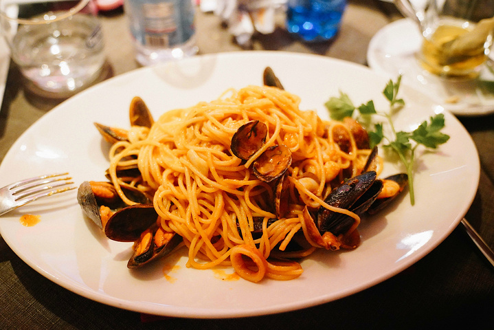 逛完了圣马可广场和大教堂,这眼睛是“看饱了”可这肚子已经饿得咕咕叫,于是我跟阿崔打算品尝一下威尼斯的美食。老早就听说威尼斯的意面特别好吃,于是乎我们就点了海鲜意面和墨鱼意面来一探虚实!