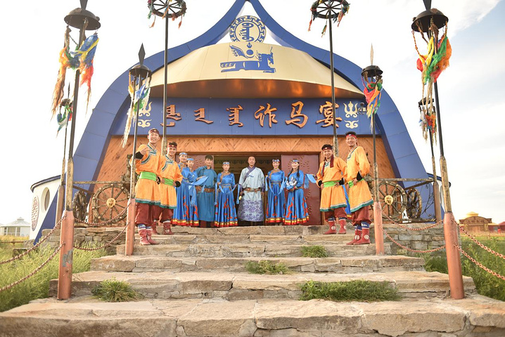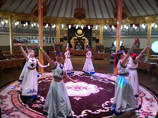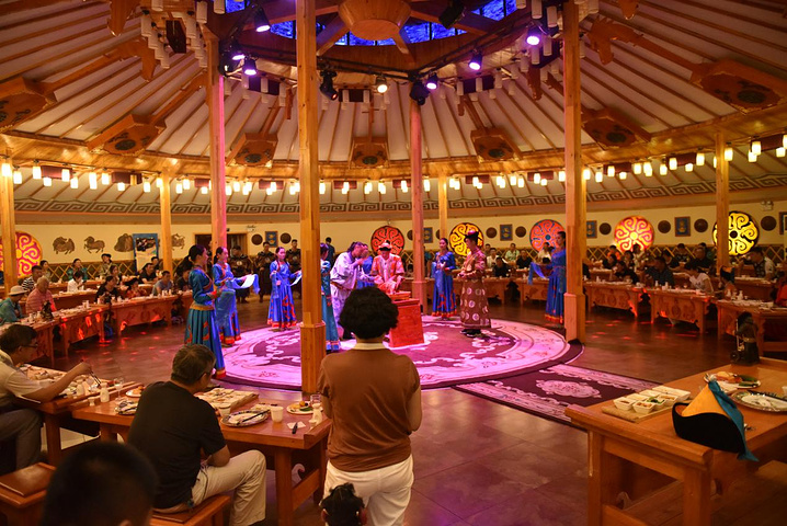 中午体验了宫廷盛宴—诈马宴,进去餐厅前,每人先换上华丽王爷王妃服,一边品尝美食,一边欣赏宫廷歌舞表演,这是一次饮食盛宴,更是视觉与听觉的盛宴,集中体验了古老而纯正的蒙古文化,原生态演绎,互动娱乐内容相结合,深刻的体验到了蒙古文化。中途还有互动环节,大家一起玩,整场盛宴边吃边玩,真是一种 享受。