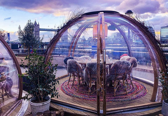 夏天的时候,装饰上绿色的植物是小清新的画风,而到了圣诞节配上毛茸茸的毯子和沙发,暖暖的灯光透出来又有点像爱斯基摩人的Igloo小屋,每个小屋里配备给力的供暖和听歌的音响,再加上美到不行的泰晤士河夜景,圣诞气氛满分!