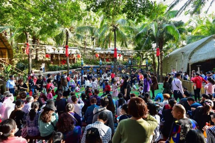 其中,彝族女子舞龙巡游和苗寨的祭龙仪式,是这次活动重头戏。游客可以参与其中,与少数民族小哥哥小姐姐们一起舞龙巡游,吹起唢呐,敲起锣鼓,跟随着浩浩荡荡的队伍,亲身感受彝族舞龙文化。苗寨中祭龙仪式场面热闹非凡,众多游客一起围走在苗族特制的龙头前祈福祝愿,据说龙头上的龙角是美好意蕴的象征。此外,最受游客欢迎的就是竹竿舞,在景区黎族村寨,近百根竹竿随着周围锣鼓打击的音乐在地面上有节奏的舞动,身着盛装的黎族姑娘小伙带领游客在一开一合的竹竿间来回跳动,锣声、鼓声、欢声笑语飘洒在整个民俗村。