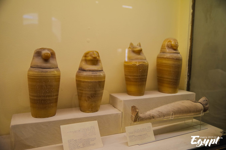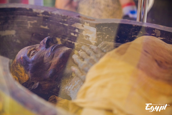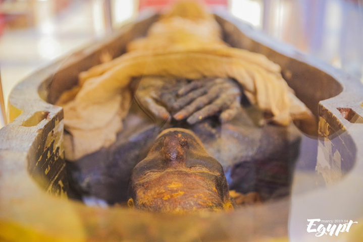 新王国时期留有很多保存很好制作精细的王室木乃伊,通过当时留存的文字、纸草及墓壁上的记载就可以对木乃伊的制作过程勾勒出一个比较具象的图画。当一个人死后,死者的亲属把尸体送到专门制作木乃伊的作坊,并仰面放在特质的桌子上。古 埃及 人认为人的智慧来自心脏而不是大脑,脑浆有碍于头部的保存,因此第一步就是将脑浆取出,而后清理出除心脏和肾以外的全部内脏。掏空的腹腔需得尼罗河水清洗,以此象征使万物复苏的母亲河水也同样对死者发挥魔力,后用香料处理尸体、用替代品将腹腔填满、使用大剂量泡碱促进尸体干化。约40天后使用树脂浸泡过的麻布将腹腔重新填满、缝合开口,尸体外用松树油、蜡、泡碱和树脂合成的物质加以涂抹,最后撒上香料。有时需要把死者的鼻子加固使其挺立,还要在眼窝里塞上东西或镶嵌人造眼球。最后用麻布包缠尸体,包裹到不同部位时,师傅们不时在麻布之间塞进护身符,祭司们还会相应地诵读经文。死者的尸体一旦制成木乃伊,则意味着摆脱了躯体的腐烂及灵魂消亡的危险,自此将命运牢牢掌握在自己手中,千难万险,也要尽快战胜困苦复活过来。博物馆的木乃伊展厅拥挤又神秘,小小的屋子陈列着十余具木乃伊,其中多属于图特摩斯家族,其中能看到经历千百年仍然被保存下来的毛发与牙齿。