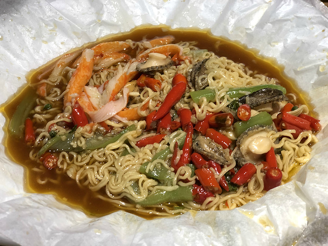 这是我最喜欢的鲍鱼面了,看着不辣,但实际上还是很辣的,鲍鱼都比较大个,面也很劲道,分量很大,可以当做主食了。
