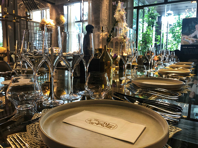 (餐具都是很正式西餐的摆法 四把叉子 三把刀 两个勺子)