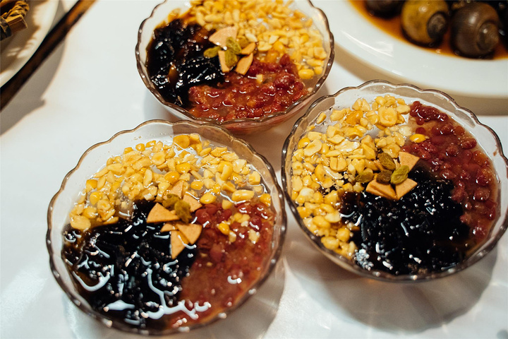 重庆特色的冰粉,里面有仙草、红豆、山楂、葡萄干、花生米和红糖之类的,吃完小龙虾来一碗,冰冰凉凉的好舒爽。