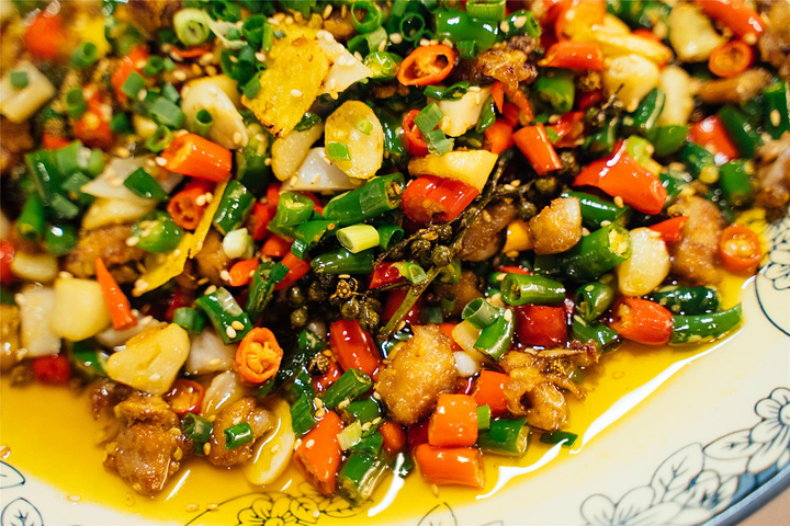 特色口味鸡,其实就是尖椒鸡的味道,鸡丁个个切的很小,帮助入味,加上青椒的香,红辣椒的辣,还有花椒的麻,加上藕丁的微微甜味,一口满是回味。