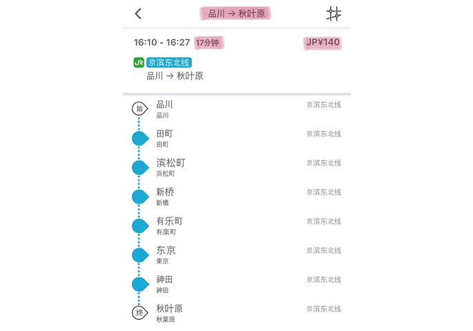 从品川到秋叶原不需要转乘,一次性就能到达!总共大约需要耗时17分钟,票价为140日元(具体信息参照“游派”地铁APP)