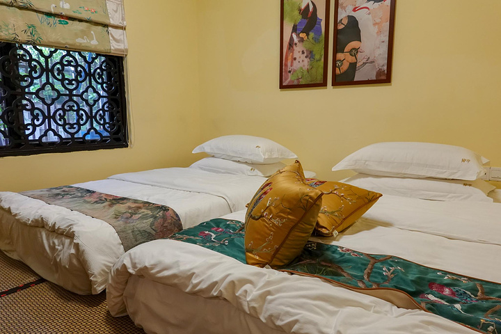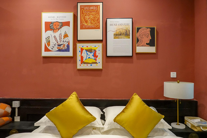 房间整个墙体是砖红色,挂画是精选过,与房间很搭。我最喜欢靠枕,金黄色丝质做底,上面是手工刺绣。浓郁的中国风,亮黄色一下子提亮了房间的色调。从各种细节里,可以看出别苑主人的用心。