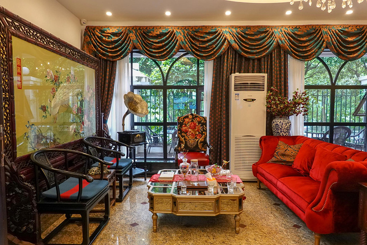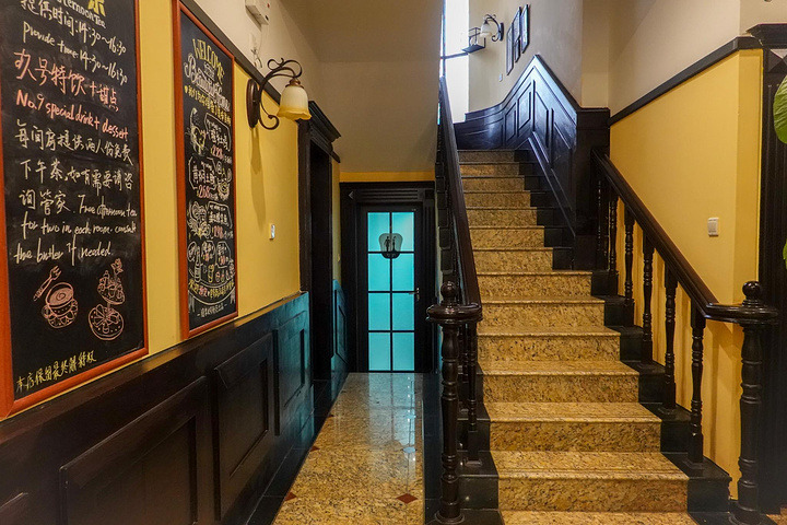 进到里面,却是精致的轻奢民国风,红丝绒沙发、木质楼梯、彩色玻璃窗,仿佛一下子穿越。大户人家的低调与品位一下子就显现出来。