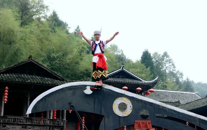从三桥出来以后,我们虽然有些饿,我们都自带干粮,饿也挡不住我们游览美景的心情 。三桥出口到天坑寨子用了半个小时的时间,到了寨子大门刚刚下车就听到了鼓声还有唢呐声,