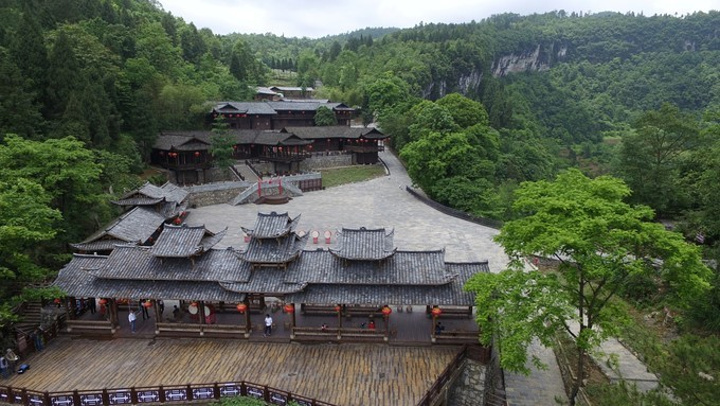 (导游费一百元)于是呢,我们就跟着这位导游一路前行。据导游介绍 武隆 天坑寨子民俗风情旅游区,中石院天坑直径达645米,是世界上口部面积最大的天坑。因其轮廓形似爱心,拥有“大地之心”的美誉。坑内云雾缭绕,鸟语花香,阡陌田园,静谧安详,仿佛与世隔绝的世外 桃源 。它因在两个举世无双的姊妹天坑(中、下石院天坑)中居住着50多户土家族、苗族原住民而闻名,与 武隆 天生三桥、印象 武隆 毗邻,地处 武隆 喀斯特世界自然遗产核心地,是 武隆 的一处新景区,一块原始瑰宝。 这里是非物质文化遗产保护传承基地,是 湖南 卫视《爸爸去哪儿》第二季的外景拍摄地,同时也是国内外宾客生态观光、科普探险、全景体验民族风情的旅游胜地,是自然和文化的双遗产。导游呢带着我们一路走,途经了中石院天坑环境平台、喊山台,对歌台,下石院天坑观景平台,把整个坑底的景色尽收眼底。