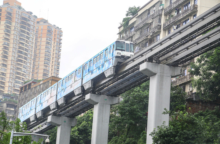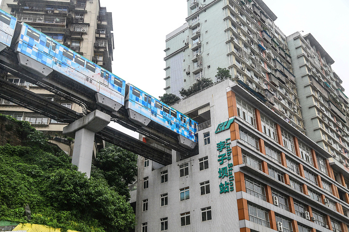 在李子坝,每隔几分钟,就有一辆沿着这条绿油油的天上轨道,缓缓驶向居民楼的轻轨到站。每隔几分钟,就有呼啸而来的轻轨。轻轨穿梭在居民楼还不够新奇,犹如过山车一般近乎九十度的弯道,这波体验只有在重庆才能感受到,不远处来了一列火车,呼啸着到站了,我们跳上了车,开启了短暂的轻轨之旅。