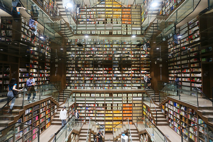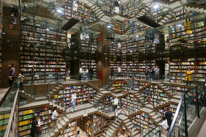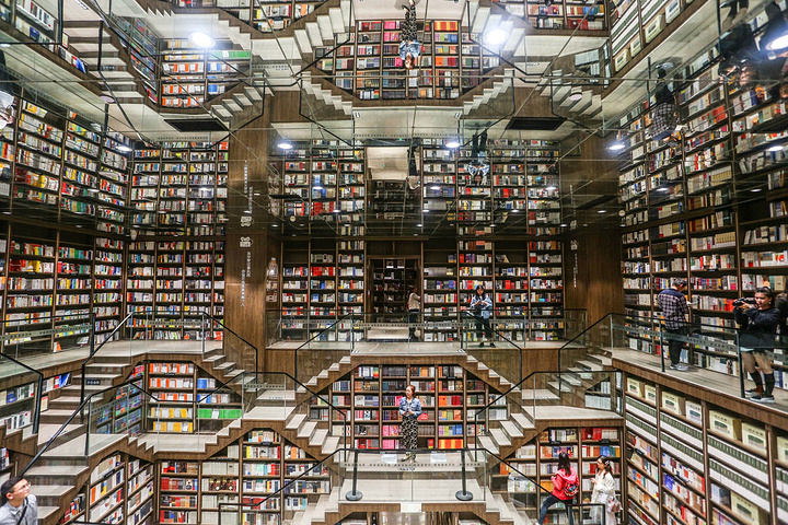 这个书店还是很大的,在中迪广场的三四楼,广场营业时间是10:00-22:00,我一早就去了,里面人还不太多,最著名的楼梯那里人就比较集中,当时还有商家在拍宣传照