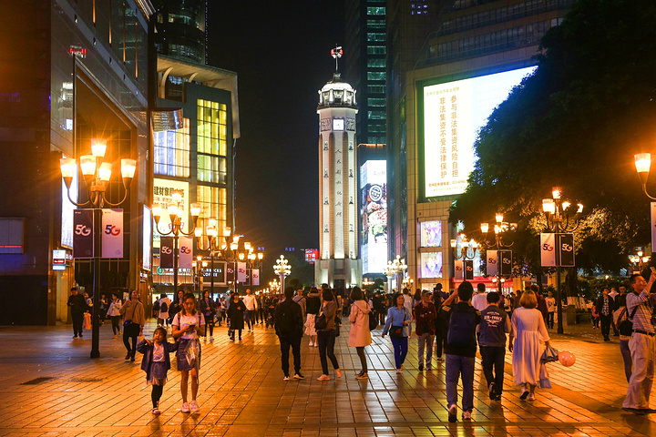 重庆解放碑,繁华都市的霓虹灯光如此耀眼,置身于解放碑这条商业大街中,有一种展望世界的成就感油然而生,看着这一座座威武霸气的高楼大厦,不禁感叹时代变幻的步伐太快了!繁华的街道,来来往往攒动的人头,商店开启的各色灯光,在这里的人们都是眼里带着商业的光,梦里做着商业的梦。现在就跟着我的脚步一起来到这重庆的地标,解放碑。解放碑是来重庆旅游不可或缺的旅游地点。到了夜晚,漫天的星星布满正片星空,一眼望去,无边无际,时不时还有飞机闪烁着光路过,看到这里,你就会有一种把梦想放飞的感觉,去远方遇见,默默在心里念着我是个断了线的风筝,但是有梦去追。解放碑带给我们不一样的境界,它帮我们展望未来,如同星星点灯。