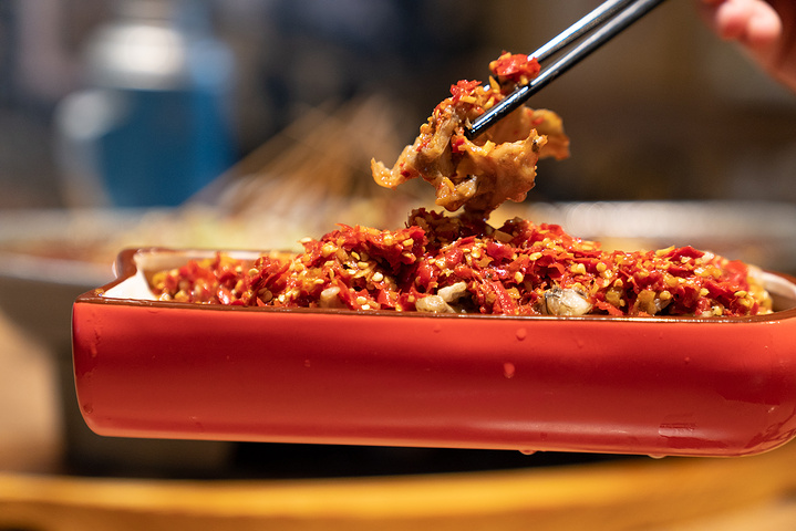 裸奔坨坨虾,算是成都吃客必点的菜了,虾壳已经剥好了,虾线已经去除,上菜时还是新鲜的虾,经过现场淋油,看着它从青变红,随随便便一口一只虾。