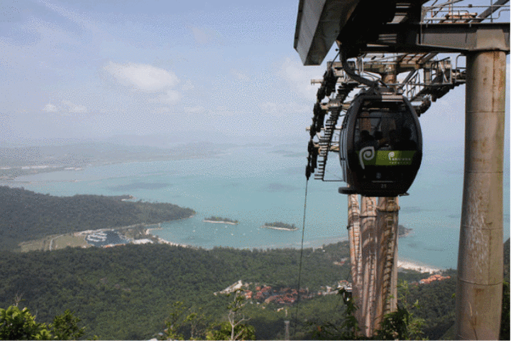 第三天,睡到自然醒,起来后天气很棒。在酒店吃了早餐,然后租车去岛上西北部的Oriental Valley看天空之桥。据说那里的缆车空中能看到兰卡威的全貌。路稍远,车程一小时左右。缆车价格是30RM每人。让宝最惊喜的是,缆车中间竟然可以下车拍照喝咖啡!拍完照回到缆车继续坐完剩下的路程。