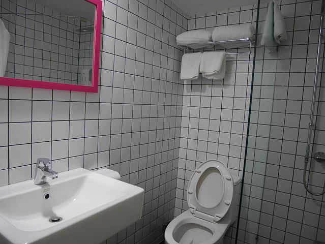 浴室还不错,门口台阶部分有明显的黑黄条纹警示,黑白格子的调调看起来也很舒服。
