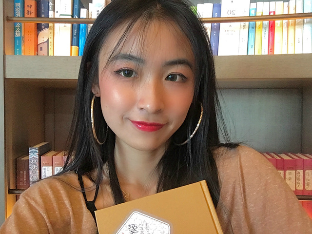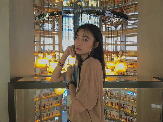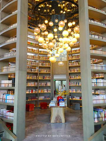 场馆不大,书架很高,落地书架从地面连接到天花板,从下往上摆满了书籍。