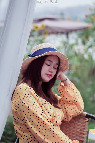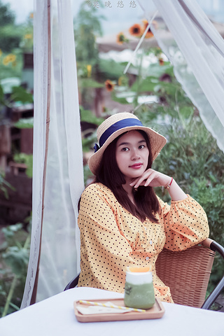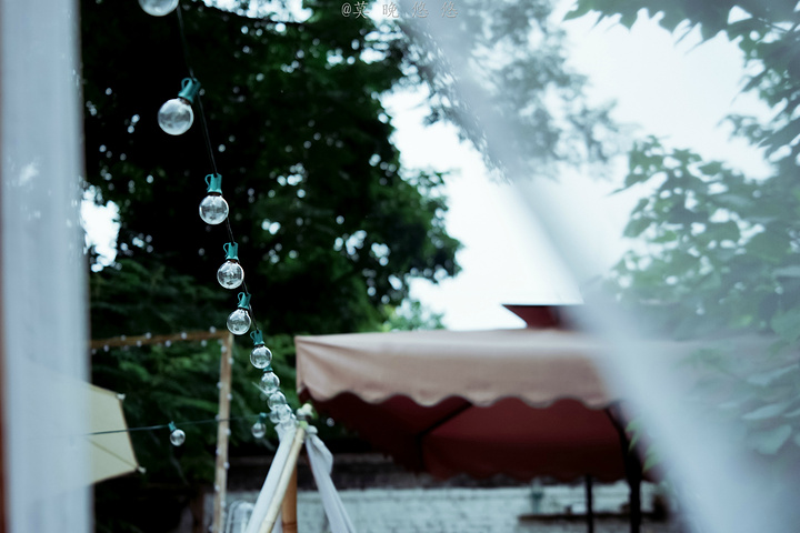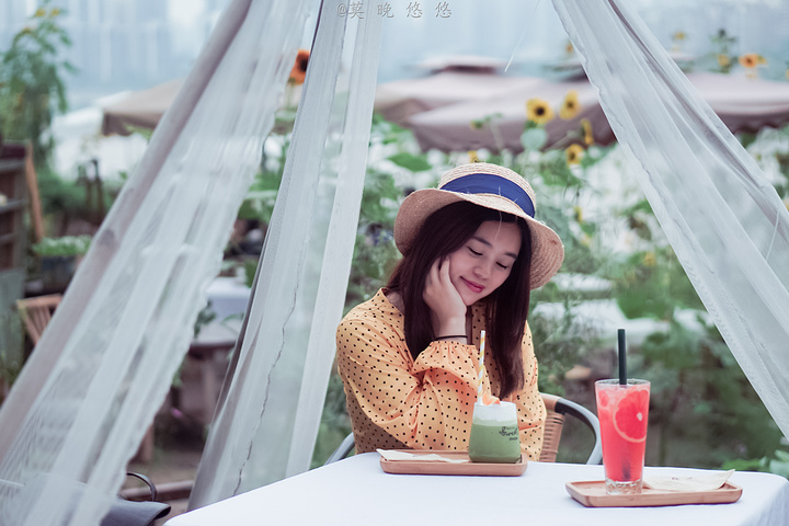 除了怀旧,还融入了新的元素在其中,房屋下边的空地上,架起一座座飘逸着白纱的小帐篷,每个小帐篷下面便是可以小憩的雅座了,而帐篷之间也有彩灯串联着,晚上的时候亮起来一定十分浪漫。而雅座周围则种满了向日葵,花开正好,为重庆的阴沉天气增添几分明媚。