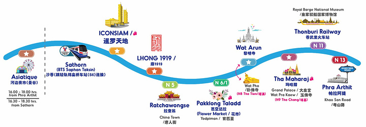 最后给大家附上一些交通贴士:除了ICON SIAM暹罗天地摩天轮夜市与BTS Sathorn站之间有免费的接驳船之外,其他的船需要在码头买票上船,具体的票价根据里程而定,路程太远的话不推荐大家打车,因为曼谷的“堵城”称号可不是浪得虚名的,真的要打车的话大家也要一定让司机打表哦,避免踩雷。