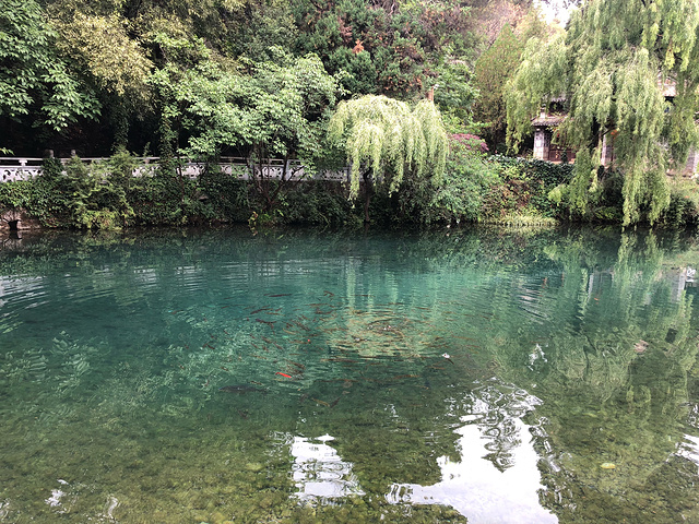 九龙潭的水特别清澈,蓝蓝的,水里的鱼看得一清二楚。
