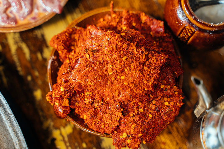 麻辣牛肉,重庆本地朋友的最爱,嫩滑的牛肉外面裹一层麻辣鲜香一应俱全的辣椒面,放进锅里一烫,所有滋味都钻进牛肉里,看她大块大块的吃,太满足了。